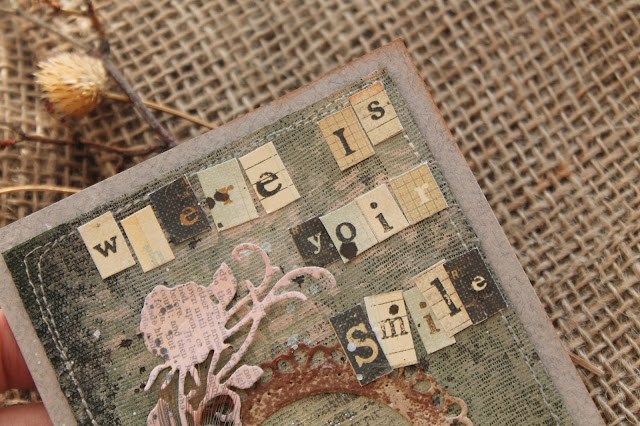 Мой "жесткий микс" на первый взгляд совсем не жесткий, я люблю гармонию и мягкость. Поэтому открытка получилась стопроцентно моя - спокойная и дымчатая. И тем не менее в ней много всего намешано: ткань и бумага, акрил, спреи и алкоголики, штампы и трафарет, два вида грунта...
